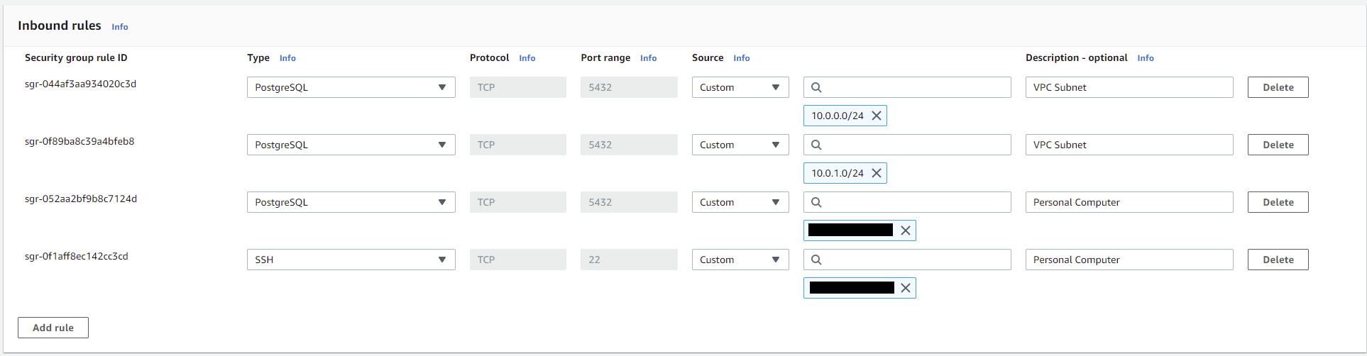 The two top rules are so other instances in your subnets can connect to your database. The third can be set to accept connections from your personal computers IP by selecting “My IP” in the source box. The fourth has a type of SSH, again from your own IP, this allows you to connect to your EC2 instance via SSH to configure it. For outbound rules you can set destination to 0.0.0.0/0 and everything else to All so everything going out will be allowed.