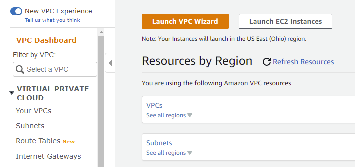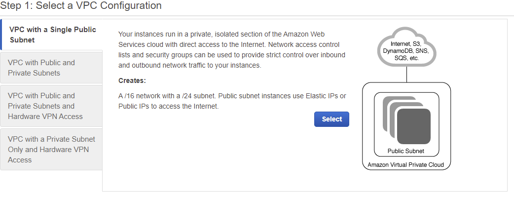 AWS creates a virtual network for you to connect all of your instances together. It’s also key to setup properly so you can access your instances from a computer connected via the internet. The easiest way to start is by using the automatic wizard from the dashboard page on the VPC console: