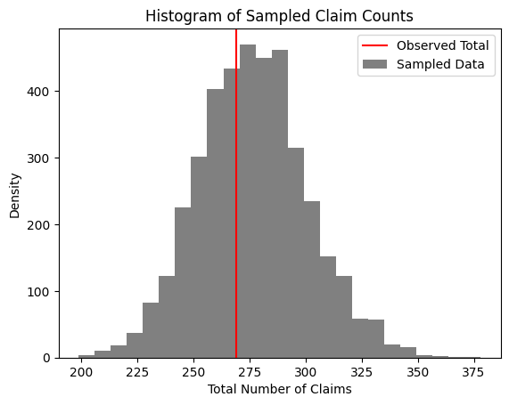 Next, we can compare the total number of claims in the dataset to our posterior distribution of the same. We expect the observed number of claims to fall in some high probability region of our posterior, which tells us that what we observe matches up with what the model is telling us: