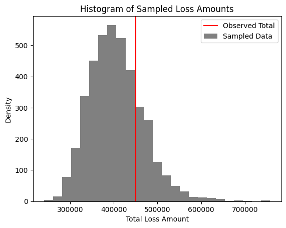 Our observed total loss amount lies a little to the right of the mode of our posterior distribution, but still lies in a reasonable area.