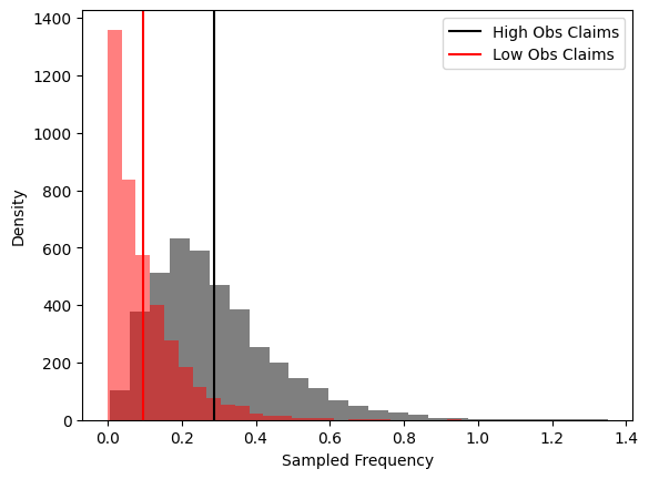 One of the problems with insurance data is that you only get one go at observing losses for a given policy in a given year. You can debate this epistemically, but in my mind the “true” claim frequency or claim severity for a policy in a given year is a latent, unobserved quantity. The only thing you actually observe as an insurer is the policy characteristics, total claim count, and total claim amount. Inferring the true underlying frequency or severity is then a statistical exercise. A useful question to ask is, given the claims we saw, what is a reasonable range of claims we could have seen? This is the question I’ll provide at least an introduction to here.