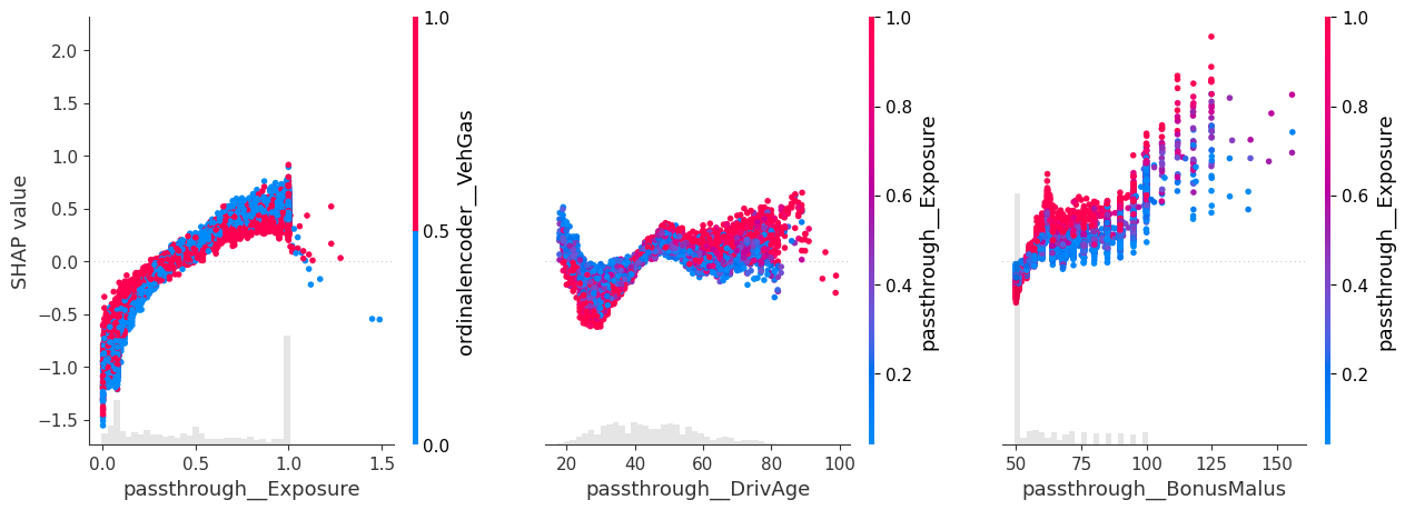 shap_values[:, ["passthrough__Exposure", "passthrough__DrivAge", "passthrough__BonusMalus"]], shap_values