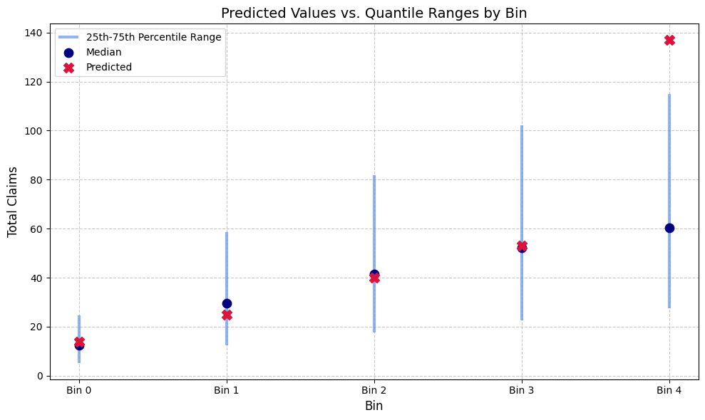 Here we can see that for each bin, we marked the model predicted total claim count, as well as the 25th, median, and 75th percentile total claim counts computed from our inference model. We can see that for bins 0 through 3, our predictions sit nicely towards the middle of the expected claims distribution. However, for bin 4, our predicted values lies past the quantile boundaries, meaning that we over-predict claim counts for policies in that bin.