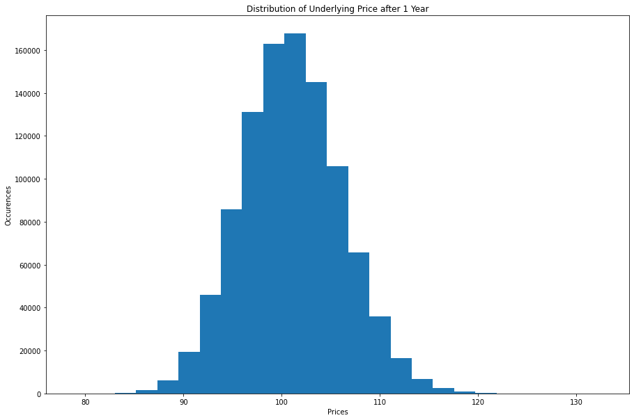 I’ll use all of the same parameters as in the example above. Let’s simulate the result of a Geometric Brownian Motion process after one year, just like Black-Scholes does.