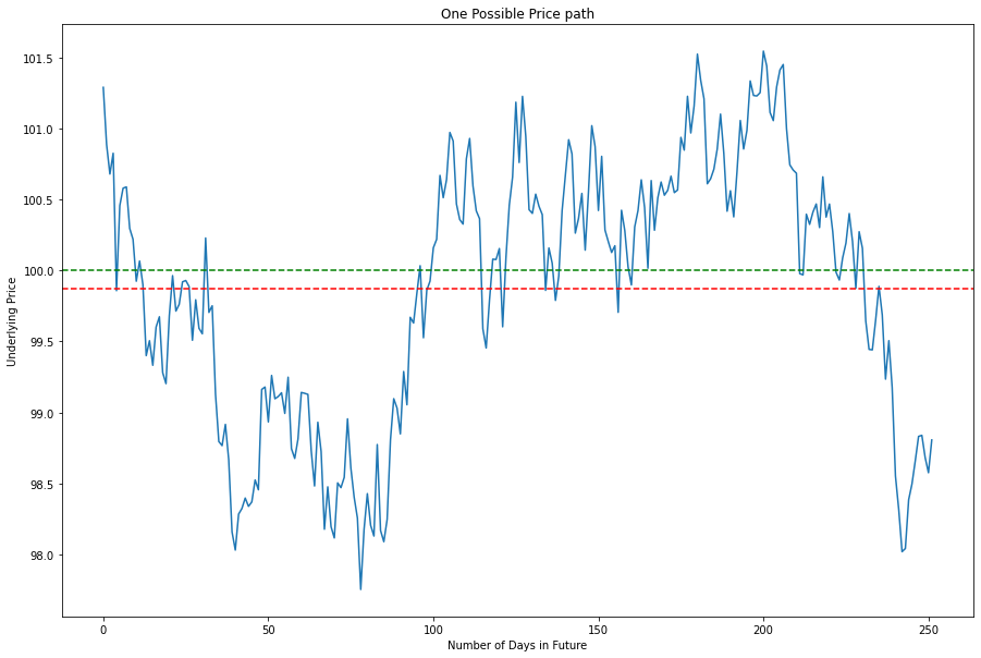 The payoff of an Asian Option given this price path is the difference between the strike price, the green dashed line, and the daily average price over the year, shown by the dashed red line. In this case, the payoff would be zero because the average daily price is below the strike.
