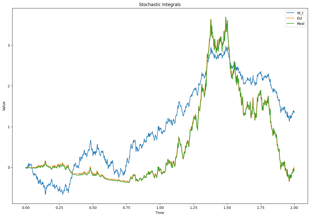 Below, we plot a Brownian Motion sample path, the known solution of the integral of that path with respect to itself, and the estimate given by the above function:
