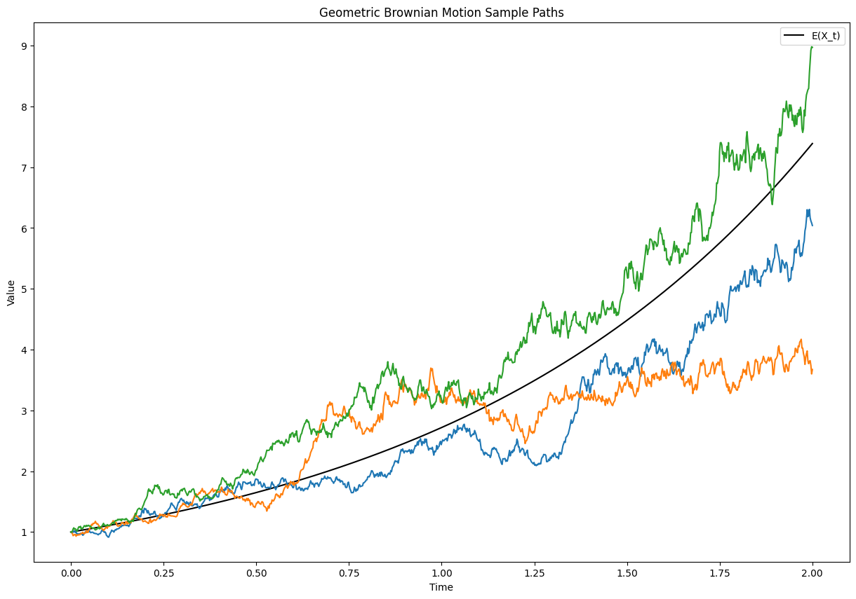 Because of this simple formula, it’s very easy to simulate sample paths of Geometric Brownian Motion once you have a Brownian Motion sample path: