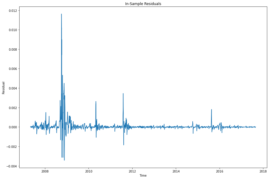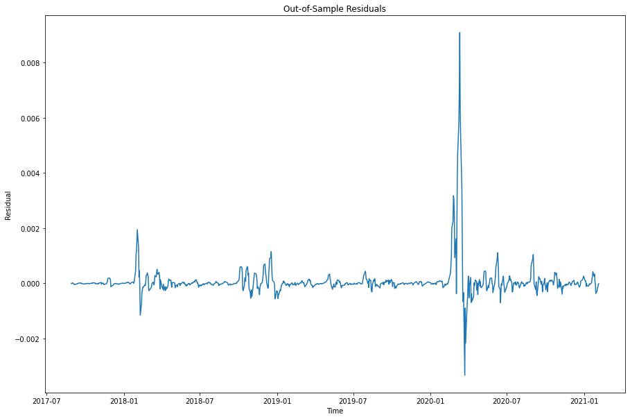 Let’s take a look at the in-sample and out-of-sample residuals. In this case, I’m making a point estimate by taking the mean of the posterior predictive distribution. It’s obvious that the model has problems predicting volatility jumps, signified by unexpected jumps in the residuals.